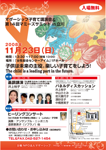 第一部 ■基調講演(13時30分〜14時15分) 「生」教育 行きぬく力を身につける 生まれる現場から少子化対策 ⇒講師:井上裕子先生(井上レディースクリニック理事長・院長/NPO法人 マザーシップ代表) ■パネルディスカッション(14時20分〜15時50分) ※医療の現場から…そして全国各地のユニークな取組み事例まで子どもの未来を見つめて、子育てと支援の在り方を考えます。 ⇒パネリスト:井上裕子先生 中山ひとみ議員(立川市議会) 岩元喜代子議員(立川市議会) 濱砂圭子(株式会社フラウ 代表取締役社長) 中橋恵美子 代表(NPO法人わははネット) 第二部 ■ヒーリングコンサート(14時20分〜15時50分) 「出づる生命 その可能性と希望と…」Lullaby・子守唄 演奏:アンサンブル・ニッポニカ、漆原恵美子さん(ソプラノ)ほか |